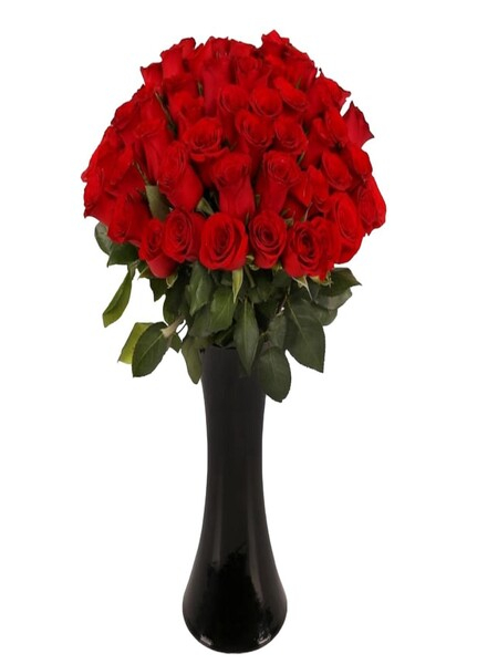 Siyah cam vazo içerisine elde toplanarak yerletirilmiş 40 adet kırmızı gül demeti.